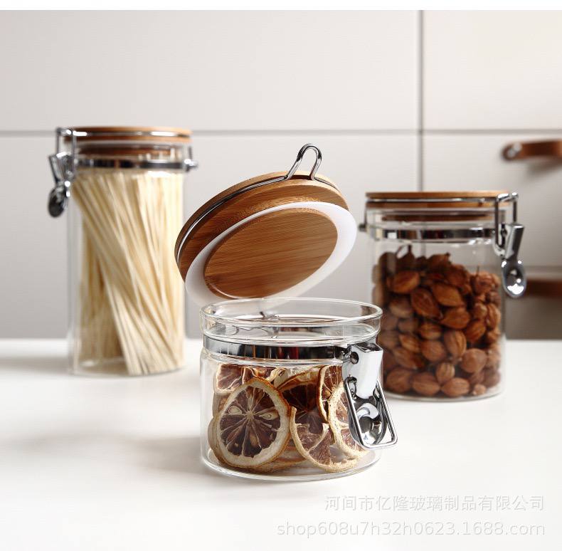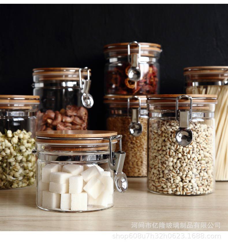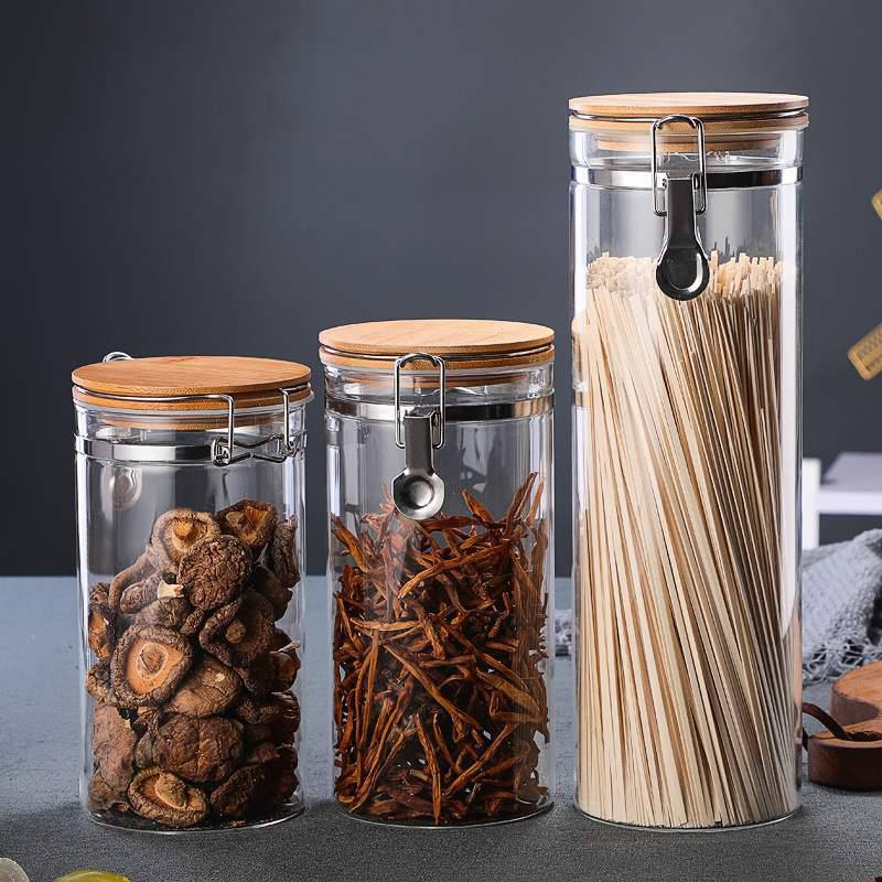 طقم برطمانات زجاجي 3 قطع احجام مختلفة بغطاء خشبي محكم الغلق لحفظ وتخزين الشاي والسكر والحبوب والبقوليات