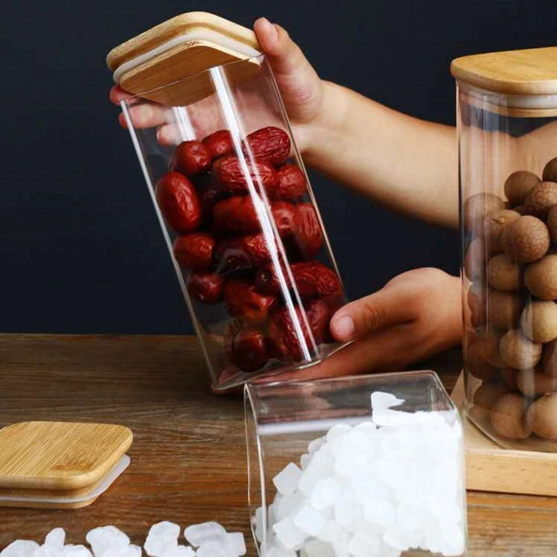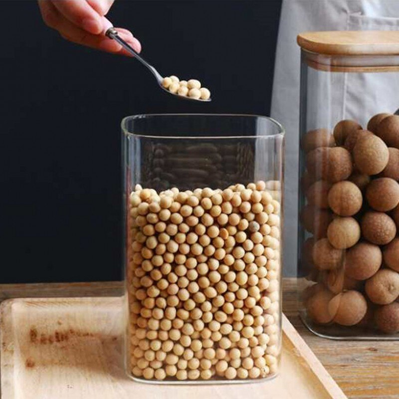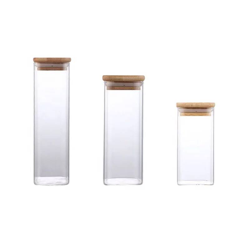 طقم برطمانات زجاج مربع 3 قطع غطاء خشبي احجام مختلفة لحفظ وتخزين الحبوب والبقوليات والتوابل