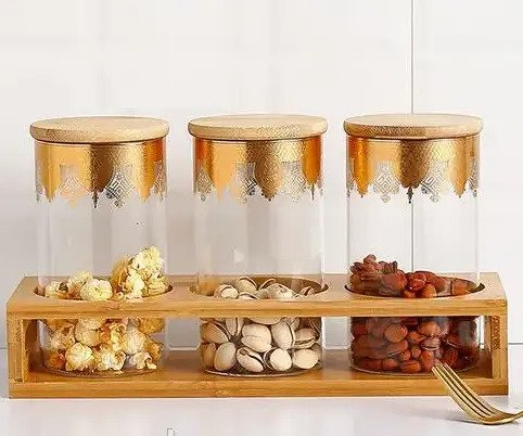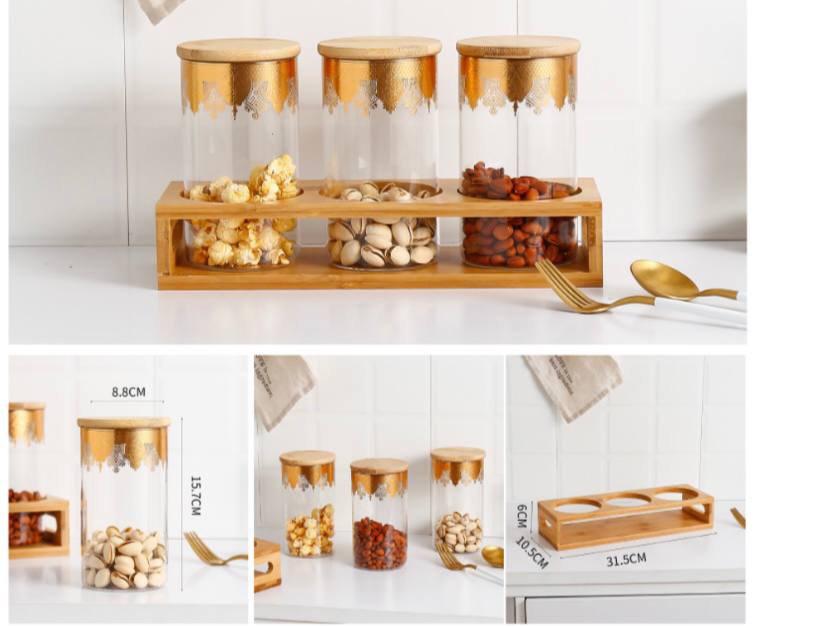 طقم برطمانات لحفظ وتنظيم البقوليات والتوابل والمكسرات والكاندي 3 قطع مع حامل خشبي من الزجاج