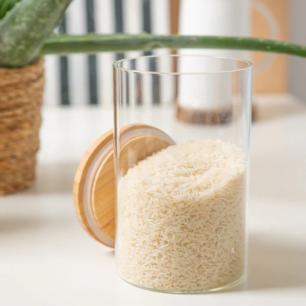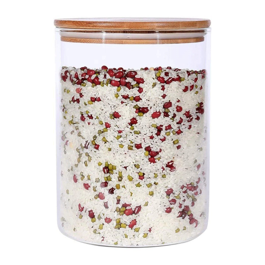علبة اكليريك بغطاء خشبي ومنظم لحفظ وتخزين الحبوب والبقوليات تسع حتي 2.3 لتر